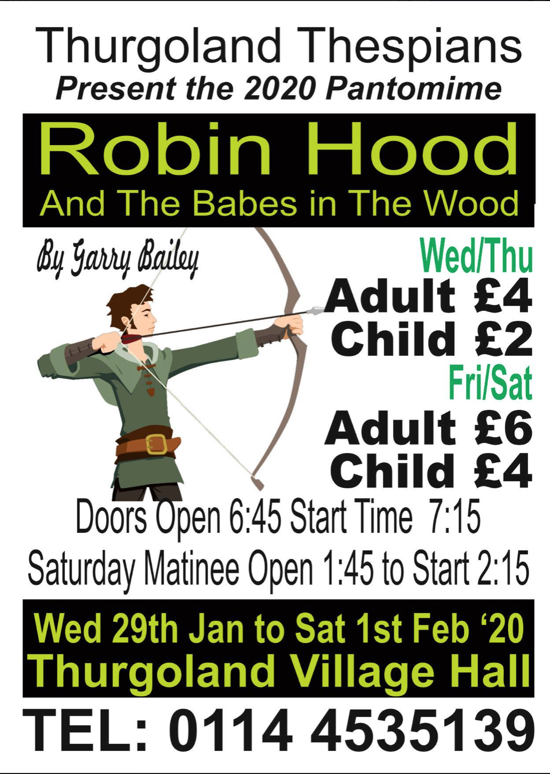 Thurgoland Thespians present Robin Hood for their 2020 Panto, see poster for details. Runs from 29/1 to 1/2